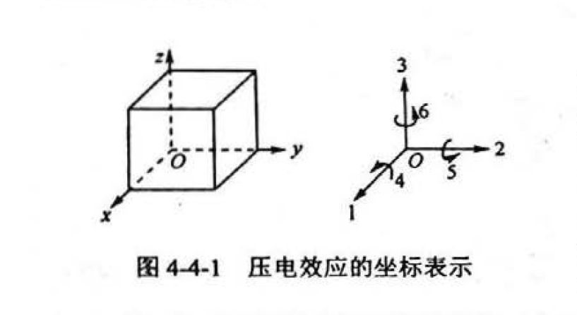 矩阵表达式为: $$ \begin{bmatrix} q_1\q_2\q_3 \end{bmatrix} = \begin{bmatrix} d_{11}&d_{12}&d_{13}&d_{14}&d_{15}&d_{16}\ d_{21}&d_{22}&d_{23}&d_{24}&d_{25}&d_{26}&\ d_{31}&d_{32}&d_{33}&d_{34}&d_{35}&d_{36}& \end{bmatrix} \begin{bmatrix} \sigma_{1}\\sigma_{2}\\sigma_{3}\\sigma_{4}\\sigma_{5}\\sigma_{6}\ \end{bmatrix} $$ q 为垂直于三个坐标轴方向的晶面上的电荷密度,σ 1-3 为作用三个坐标轴方向上的力, 4-6 为剪切应力。